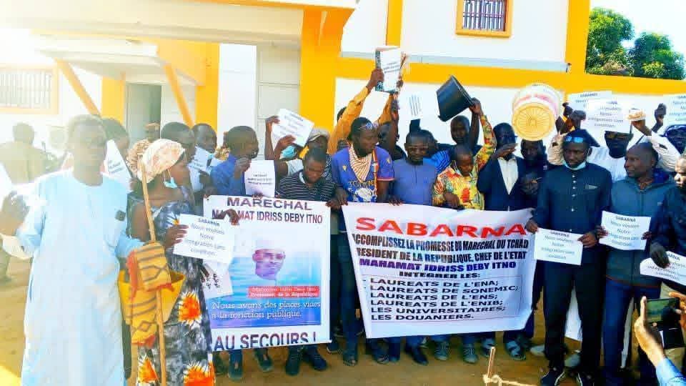Ce jeudi 18 décembre 2025, des diplômés sans emploi membres de la plateforme #Sabarna ont organisé un sit-in devant le nouveau siège du ministère de la Fonction publique à Amriguebé, 5ᵉ arrondissement de N’Djamena.